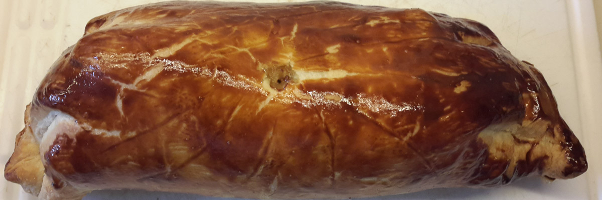 Etaler la pâte feuilletée et déposer les tranches de jambon. Recouvrir le filet de moutarde et le déposer sur la pâte avec les oignons. Rouler la pâte et les soudures doivent se retrouver en dessous et la dorer avec le jaune d'oeuf. Laisser cuire au four 35 min à 180 °.